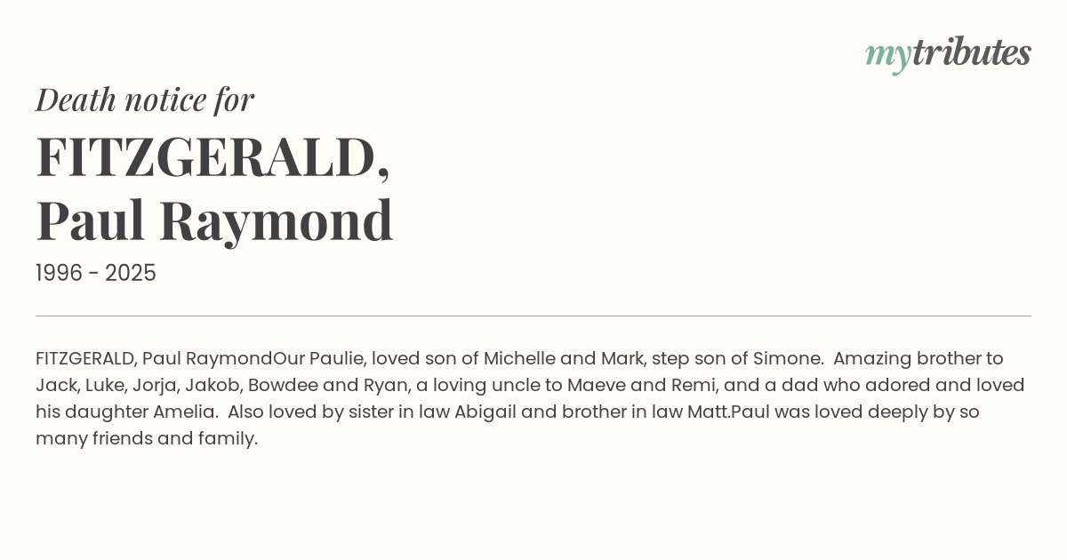 Our Paulie, loved son of Michelle and Mark, step son of Simone. Amazing brother to Jack, Luke, Jorja, Jakob, Bowdee and Ryan, a loving uncle to Maeve and Remi, and a dad who adored and loved his daughter Amelia. Also loved by sister in law Abigail and brother in law Matt.