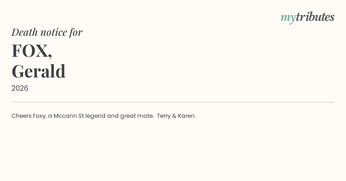 Cheers Foxy, a Mccann St legend and great mate. Terry & Karen