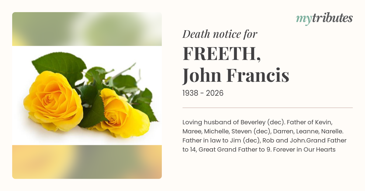 15°CLoving husband of Beverley (dec). Father of Kevin, Maree, Michelle, Steven (dec), Darren, Leanne, Narelle.