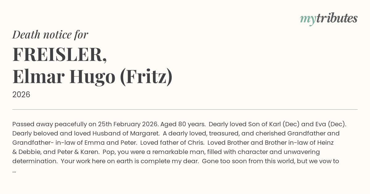 Refer to our website for Elmar’s funeral details to be advised.