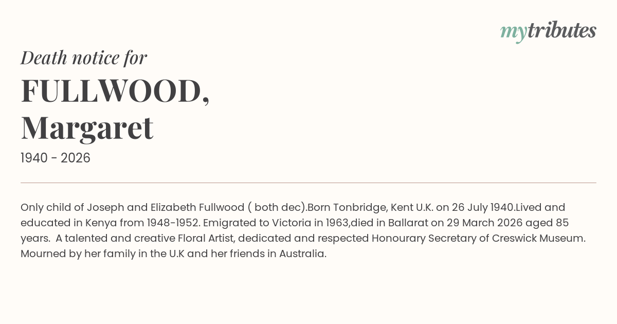 Born Tonbridge, Kent U.K. on 26 July 1940.Lived and educated in Kenya from 1948-1952. Emigrated to Victoria in 1963,died in Ballarat on 29 March 2026 aged 85 years. A talented and creative Floral Artist, dedicated and respected Honourary Secretary of Creswick Museum. Mourned by her family in the U.K and her friends in Australia.