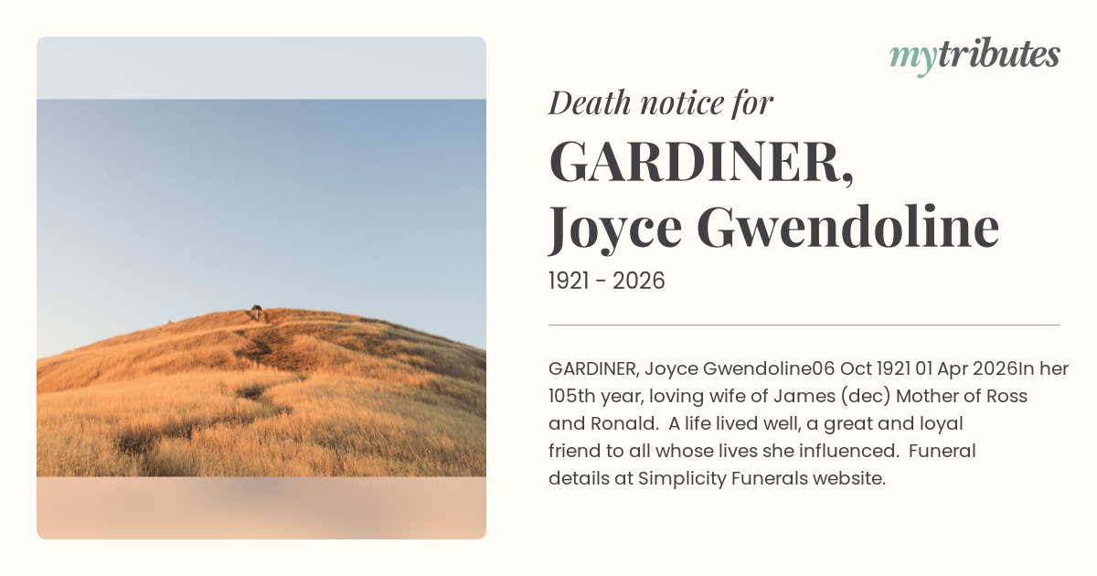 In her 105th year, loving wife of James (dec) Mother of Ross and Ronald. A life lived well, a great and loyal friend to all whose lives she influenced. Funeral details at Simplicity Funerals website.
