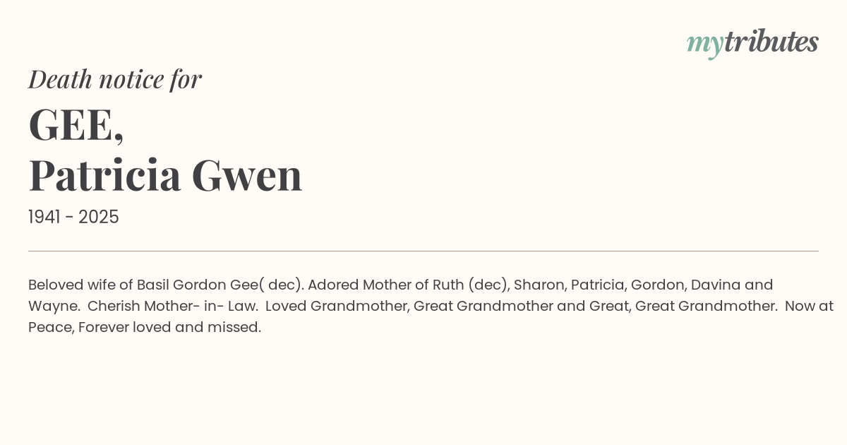 15°CBeloved wife of Basil Gordon Gee( dec). Adored Mother of Ruth (dec), Sharon, Patricia, Gordon, Davina and Wayne. Cherish Mother- in- Law. Loved Grandmother, Great Grandmother and Great, Great Grandmother. Now at Peace, Forever loved and missed.