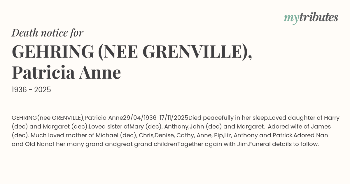 John (dec) and Margaret. Adored wife of James (dec). Much loved mother of Michael (dec), Chris,