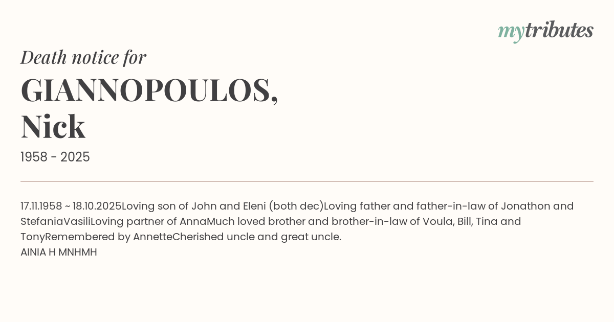 Much loved brother and brother-in-law of Voula, Bill, Tina and Tony