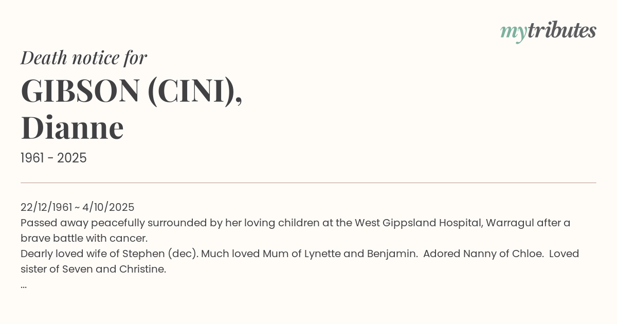 Passed away peacefully surrounded by her loving children at the West Gippsland Hospital, Warragul after a brave battle with cancer.