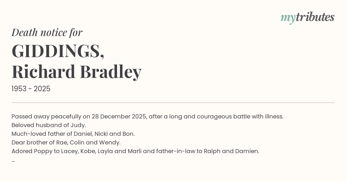 15°CPassed away peacefully on 28 December 2025, after a long and courageous battle with illness.