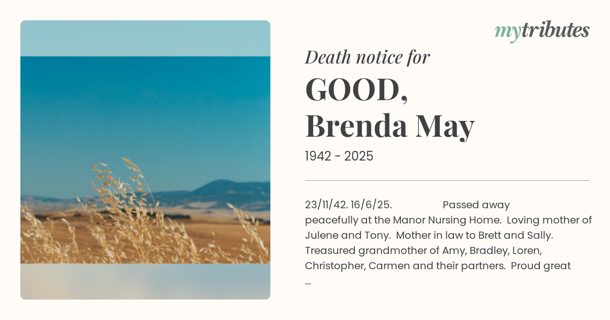 Passed away peacefully at the Manor Nursing Home. Loving mother of Julene and Tony. Mother in law to Brett and Sally. Treasured grandmother of Amy, Bradley, Loren, Christopher, Carmen and their partners. Proud great grandmother of Eli, George, Maggie, Harper, Lyla and Parker. Reunited with your loving husband in heaven. You will be always loved and sadly missed. Special thanks to the nurses and carers from the Manor Nursing Home for their care and kindness shown to our mother. Thank you to Dr Leanne Jones and Jane Laidlaw for their compassion. A private cremation service was held as per Brenda’s wishes.