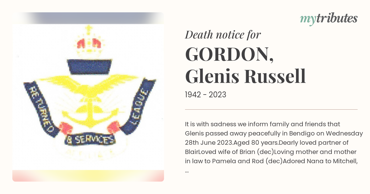 15°CIt is with sadness we inform family and friends that Glenis passed away peacefully in Bendigo on Wednesday 28th June 2023.