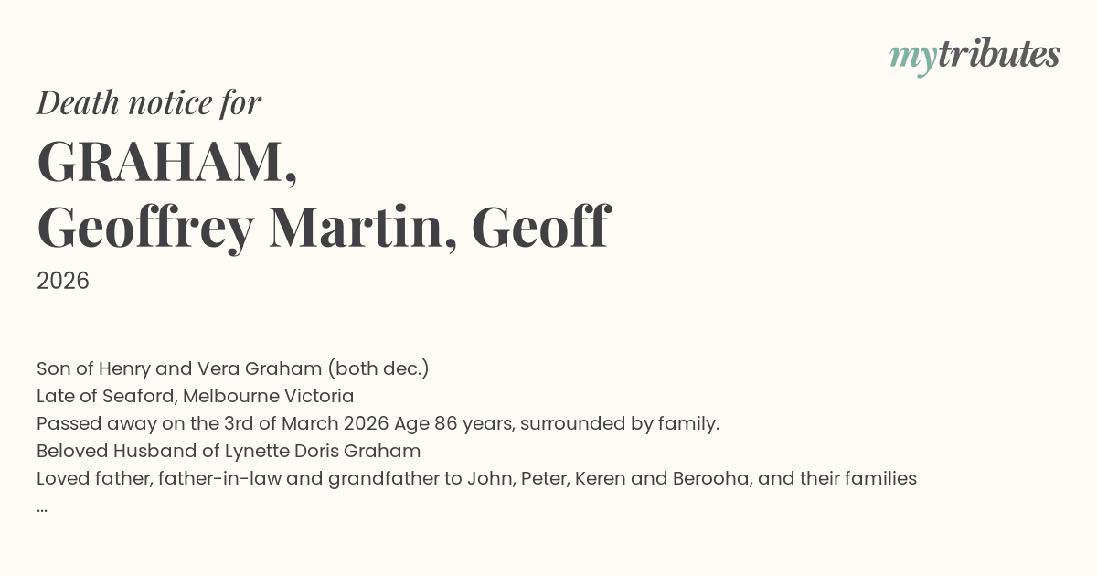 Passed away on the 3rd of March 2026 Age 86 years, surrounded by family.