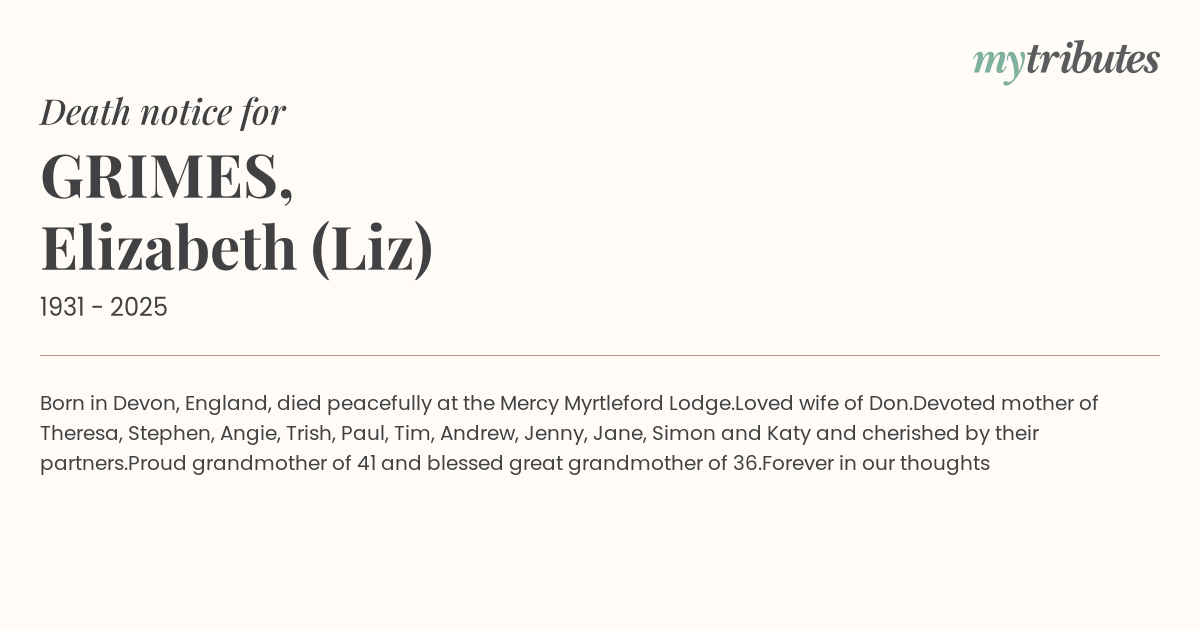 15°CBorn in Devon, England, died peacefully at the Mercy Myrtleford Lodge.