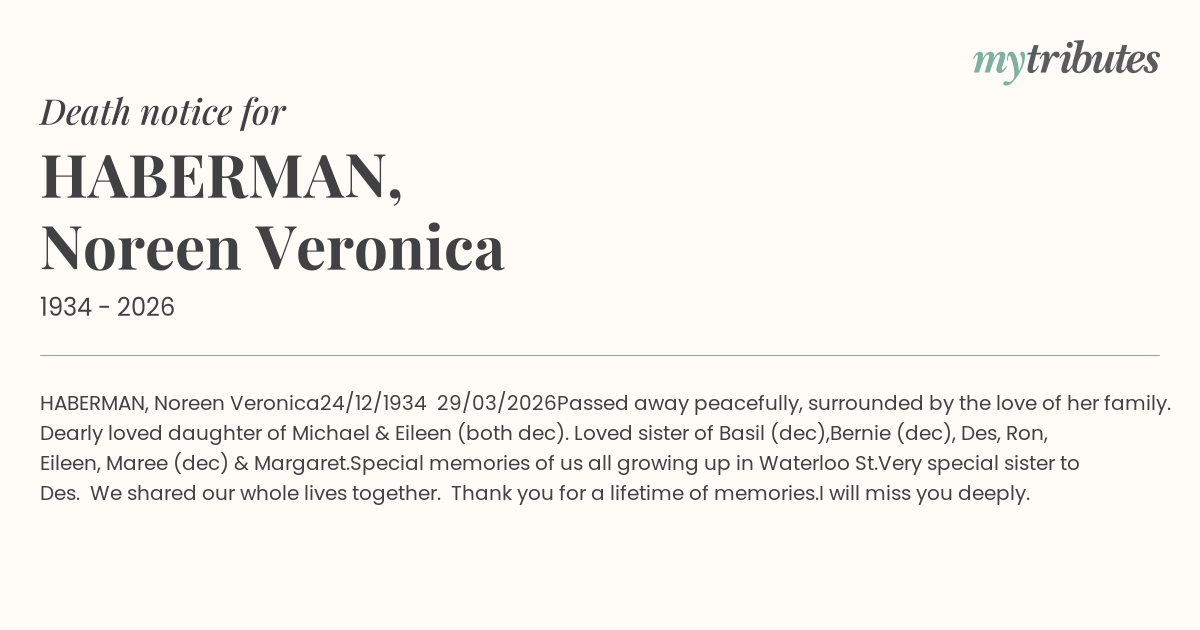 Passed away peacefully, surrounded by the love of her family. Dearly loved daughter of Michael & Eileen (both dec). Loved sister of Basil (dec),Bernie (dec), Des, Ron, Eileen, Maree (dec) & Margaret.