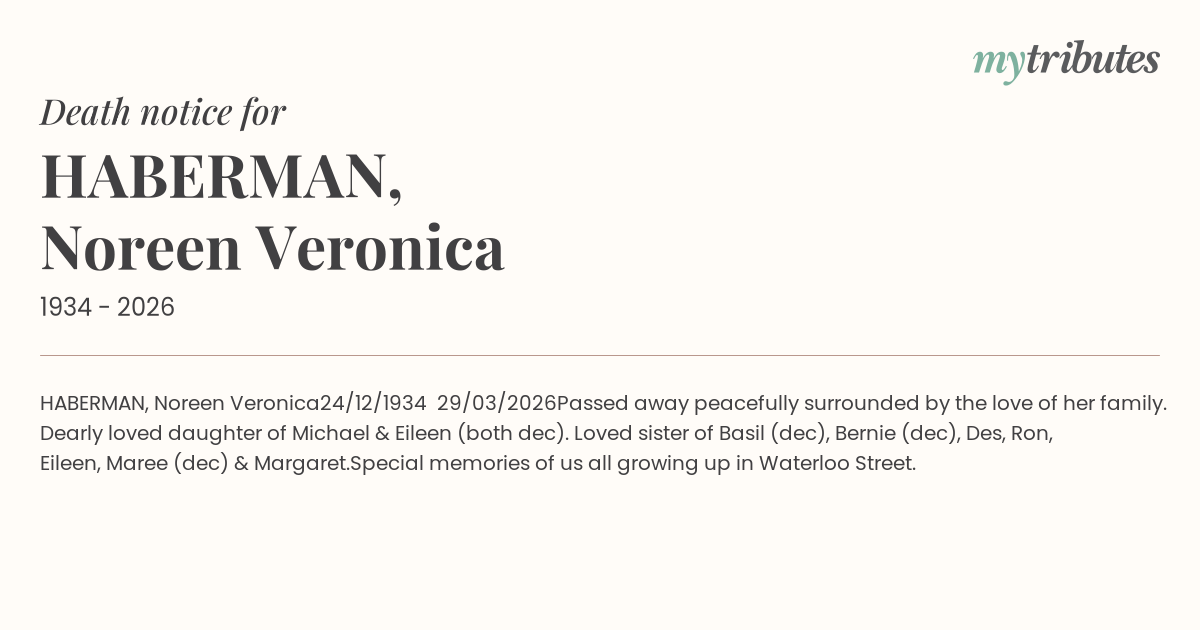 Passed away peacefully surrounded by the love of her family. Dearly loved daughter of Michael & Eileen (both dec). Loved sister of Basil (dec), Bernie (dec), Des, Ron, Eileen, Maree (dec) & Margaret.
