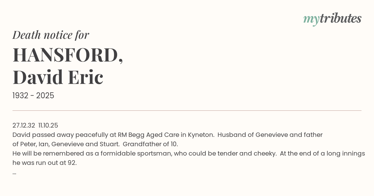 David passed away peacefully at RM Begg Aged Care in Kyneton. Husband of Genevieve and father