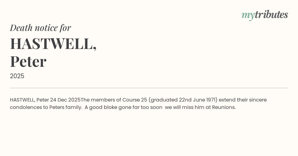 The members of Course 25 (graduated 22nd June 1971) extend their sincere condolences to Peter’s family. A good bloke gone far too soon … we will miss him at Reunions.