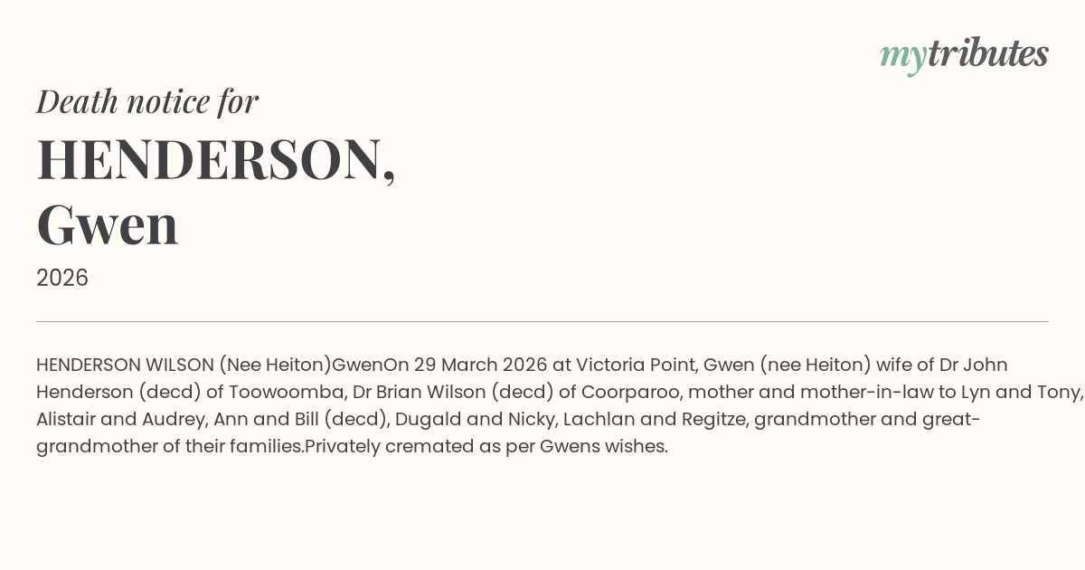 On 29 March 2026 at Victoria Point, Gwen (nee Heiton) wife of Dr John Henderson (dec’d) of Toowoomba, Dr Brian Wilson (dec’d) of Coorparoo, mother and mother-in-law to Lyn and Tony, Alistair and Audrey, Ann and Bill (dec’d), Dugald and Nicky, Lachlan and Regitze, grandmother and great-grandmother of their families.