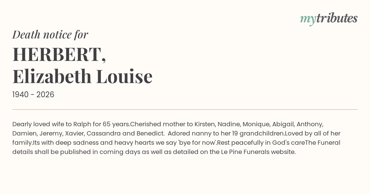 Cherished mother to Kirsten, Nadine, Monique, Abigail, Anthony, Damien, Jeremy, Xavier, Cassandra and Benedict. Adored nanny to her 19 grandchildren.