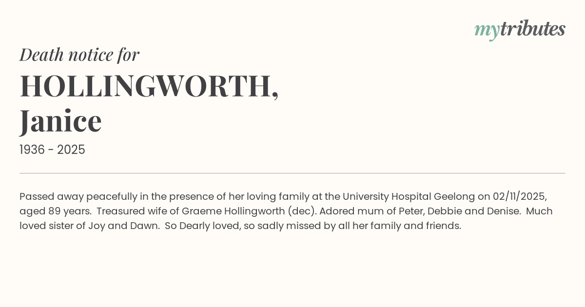 15°CPassed away peacefully in the presence of her loving family at the University Hospital Geelong on 02/11/2025, aged 89 years. Treasured wife of Graeme Hollingworth (dec). Adored mum of Peter, Debbie and Denise. Much loved sister of Joy and Dawn. So Dearly loved, so sadly missed by all her family and friends.