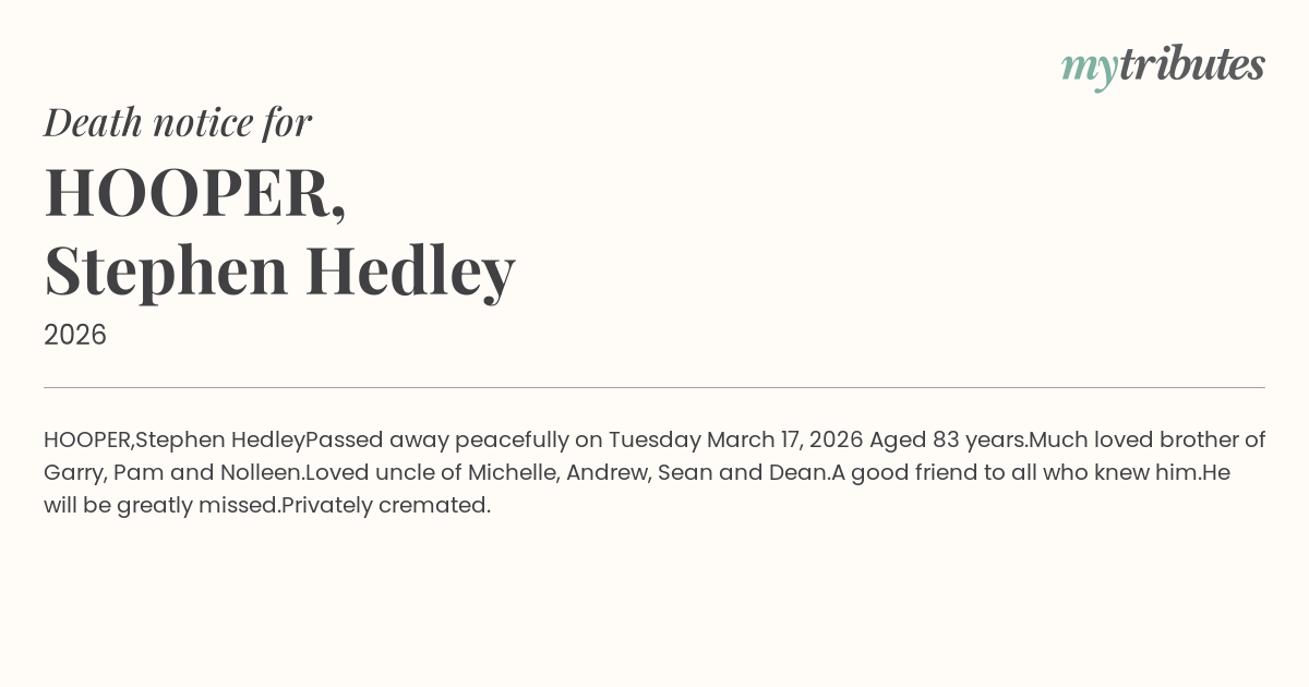 Passed away peacefully on Tuesday March 17, 2026 Aged 83 years.