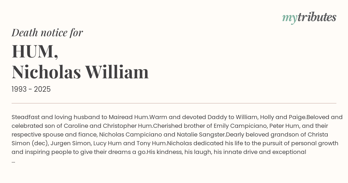 Cherished brother of Emily Campiciano, Peter Hum, and their respective spouse and fiancée, Nicholas Campiciano and Natalie Sangster.