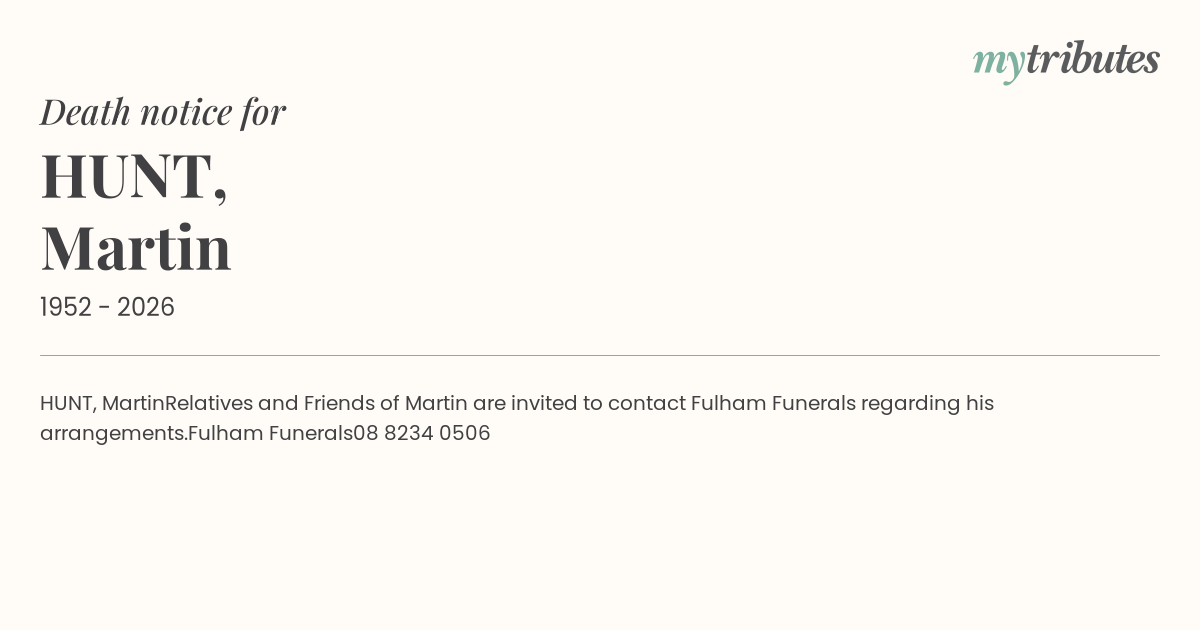 Relatives and Friends of Martin are invited to contact Fulham Funerals regarding his arrangements.
