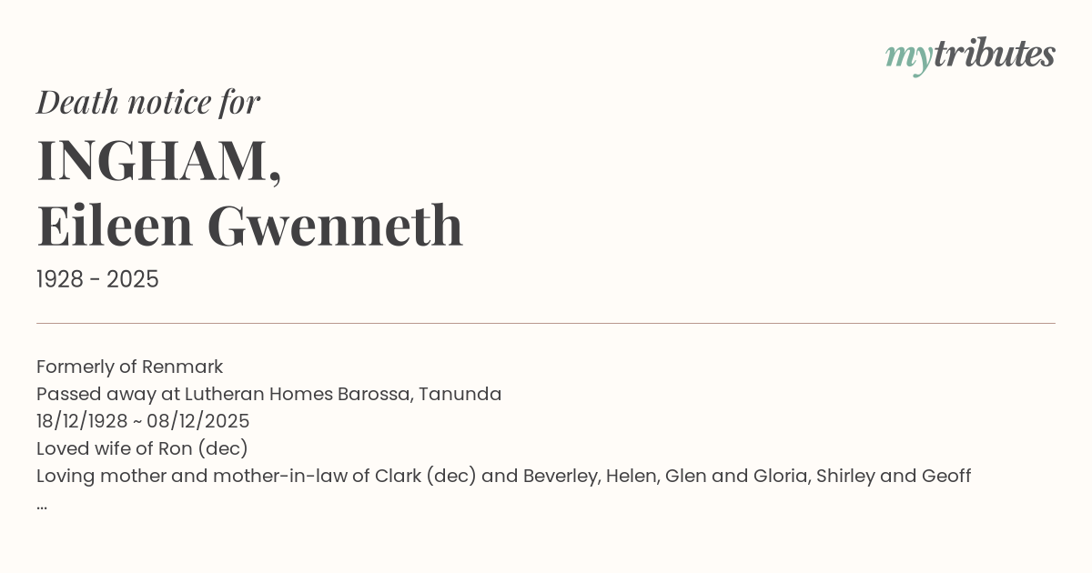 Passed away at ‘Lutheran Homes Barossa’, Tanunda
