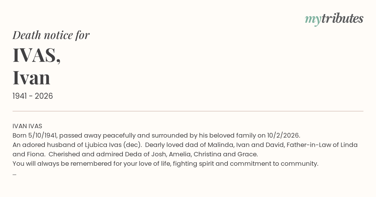 An adored husband of Ljubica Ivas (dec). Dearly loved dad of Malinda, Ivan and David, Father-in-Law of Linda and Fiona. Cherished and admired Deda of Josh, Amelia, Christina and Grace.