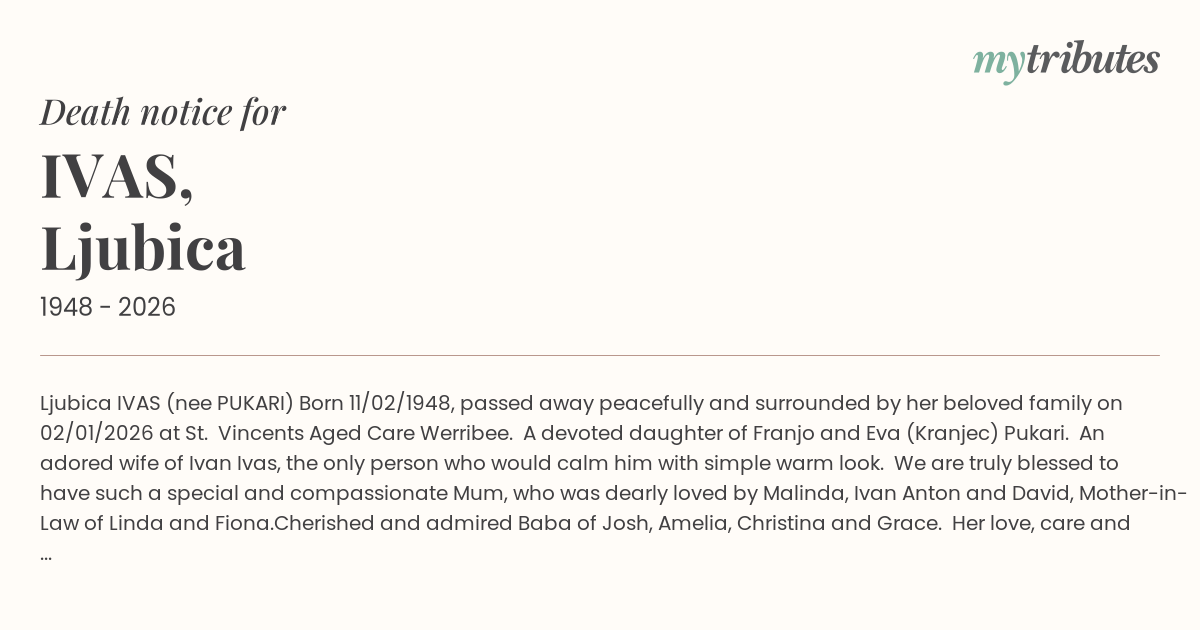 15°CLjubica IVAS (nee PUŠKARIĆ) Born 11/02/1948, passed away peacefully and surrounded by her beloved family on 02/01/2026 at St. Vincent’s Aged Care Werribee.