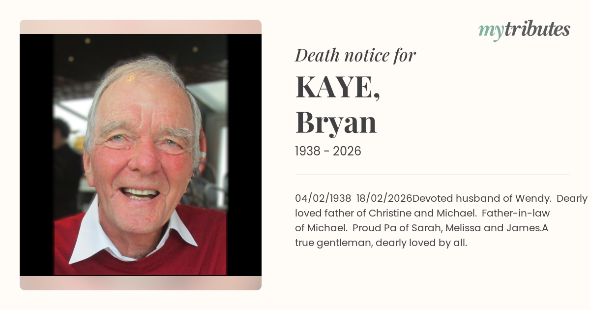 Devoted husband of Wendy. Dearly loved father of Christine and Michael. Father-in-law of Michael. Proud Pa of Sarah, Melissa and James.