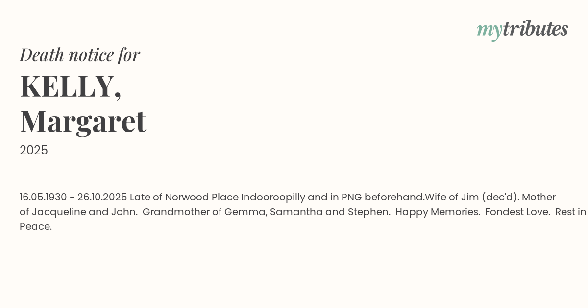 Late of Norwood Place Indooroopilly and in PNG beforehand.
