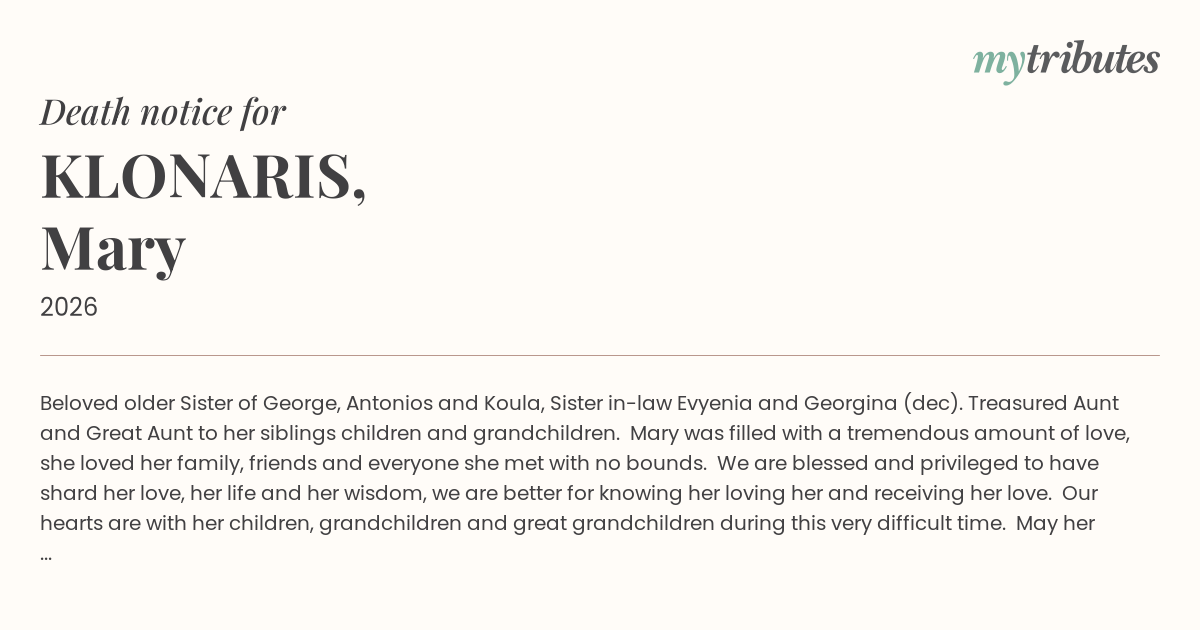 15°CBeloved older Sister of George, Antonios and Koula, Sister in-law Evyenia and Georgina (dec). Treasured Aunt and Great Aunt to her siblings children and grandchildren.