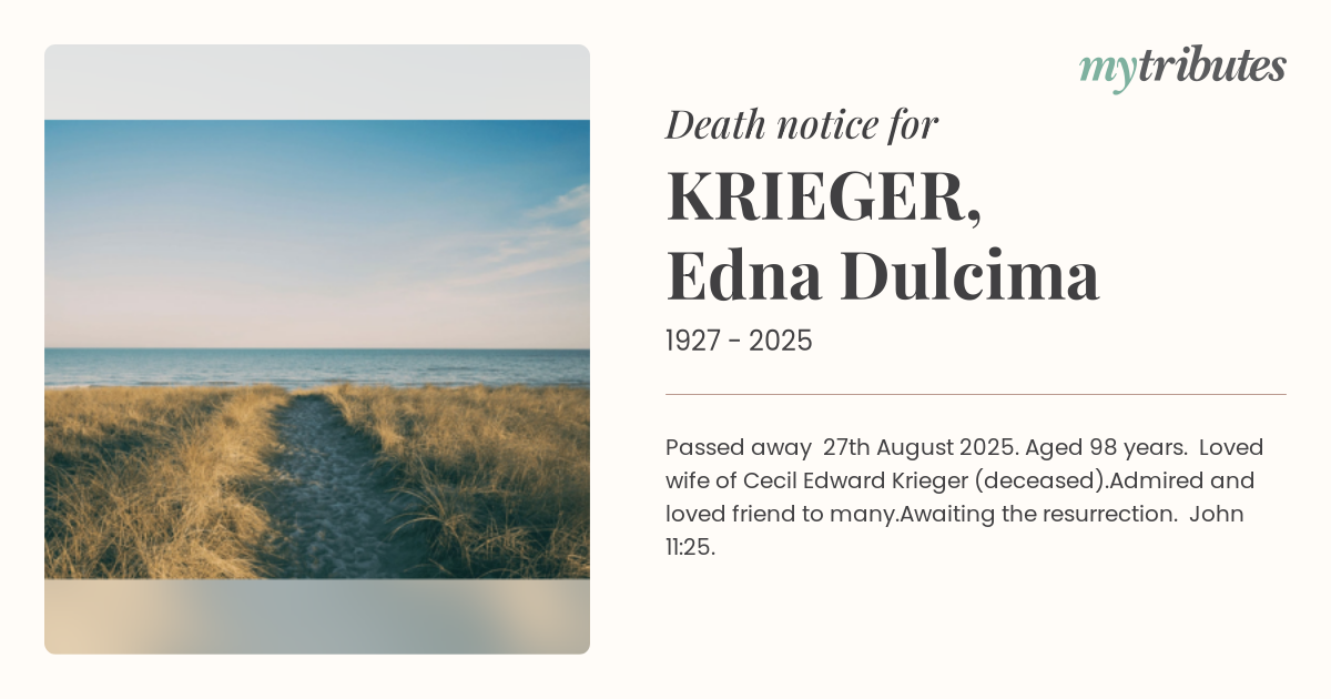15°CPassed away 27th August 2025. Aged 98 years. Loved wife of Cecil Edward Krieger (deceased).