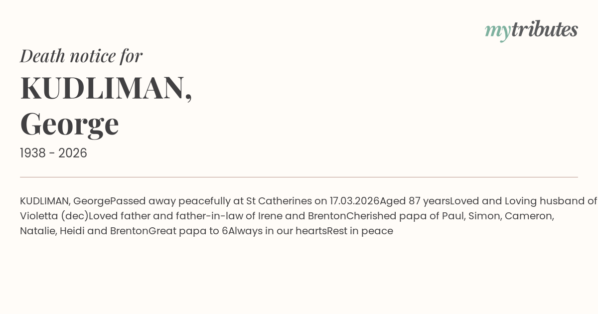 Passed away peacefully at St Catherines on 17.03.2026