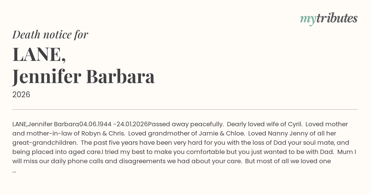 Passed away peacefully. Dearly loved wife of Cyril. Loved mother and mother-in-law of Robyn & Chris. Loved grandmother of Jamie & Chloe. Loved Nanny Jenny of all her great-grandchildren. The past five years have been very hard for you with the loss of Dad your soul mate, and being placed into aged care.
