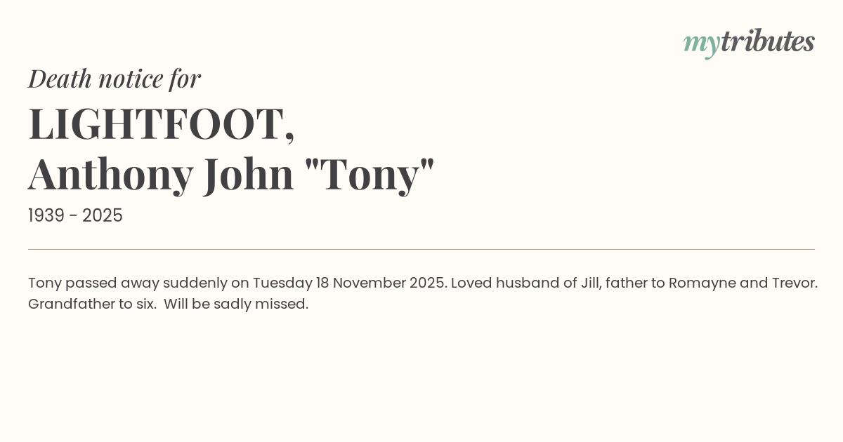 15°CTony passed away suddenly on Tuesday 18 November 2025. Loved husband of Jill, father to Romayne and Trevor. Grandfather to six. Will be sadly missed.