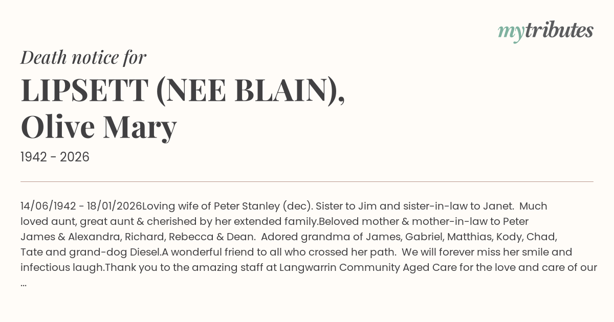 Beloved mother & mother-in-law to Peter James & Alexandra, Richard, Rebecca & Dean. Adored grandma of James, Gabriel, Matthias, Kody, Chad, Tate and grand-dog Diesel.