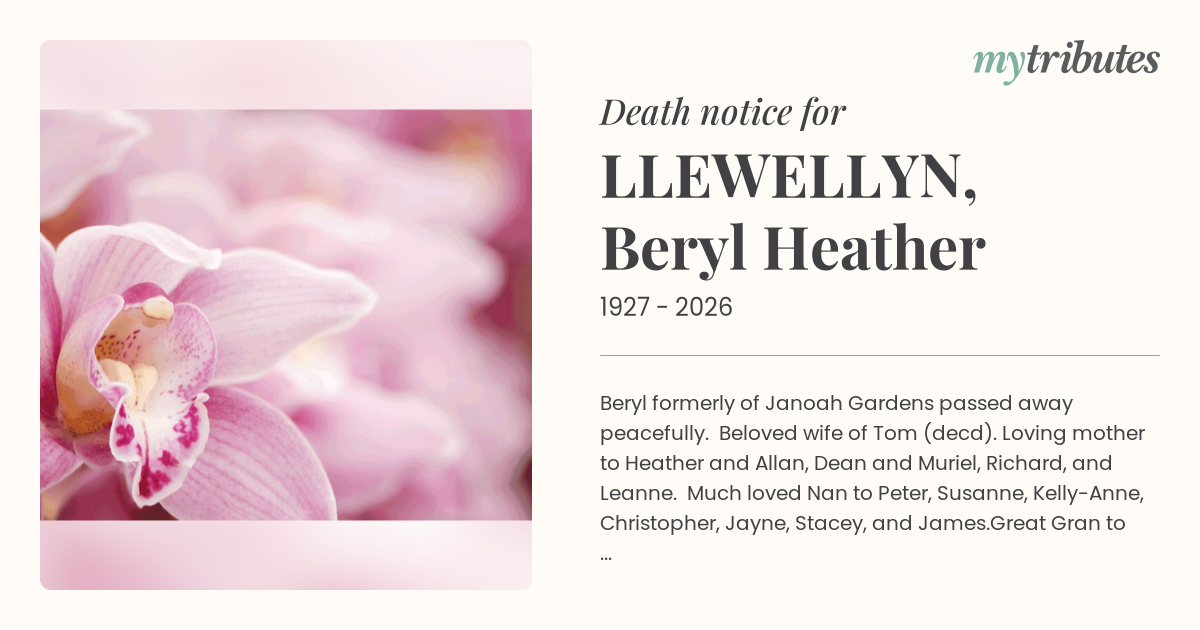 15°CBeryl formerly of Janoah Gardens passed away peacefully. Beloved wife of Tom (dec’d). Loving mother to Heather and Allan, Dean and Muriel, Richard, and Leanne. Much loved Nan to Peter, Susanne, Kelly-Anne, Christopher, Jayne, Stacey, and James.Great Gran to Carys, Alistair, Mollie, Emilia, Caleb, Thomas, Danny, Una, Oscar, and Hunter.Beryl’s Memorial Service will be on Tuesday 7th April at 1.30pm at Janoah Gardens Aged Care Facility, 11 Audell Street, Manly West.