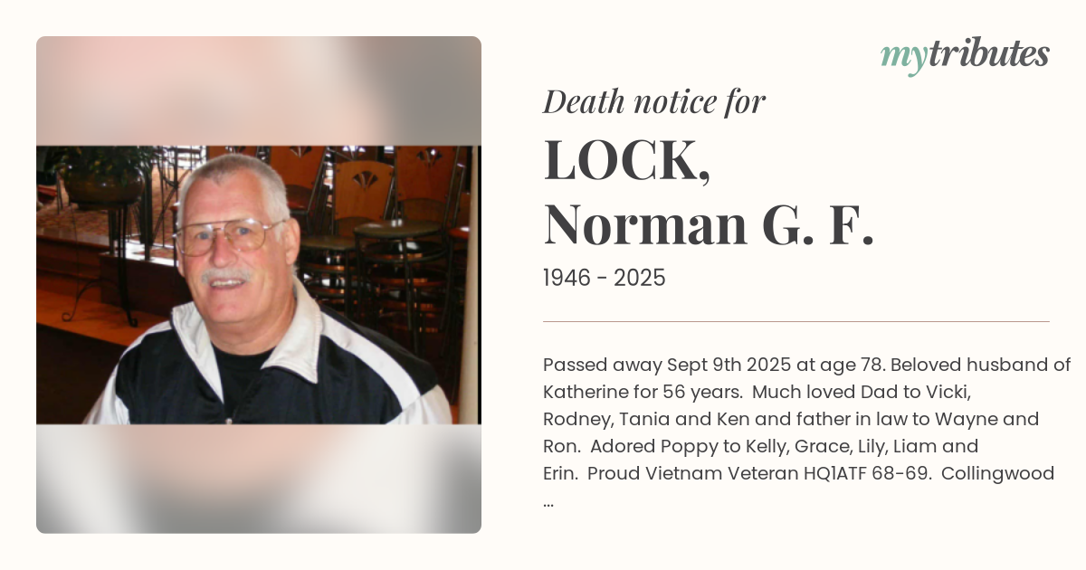 15°CPassed away Sept 9th 2025 at age 78. Beloved husband of Katherine for 56 years. Much loved Dad to Vicki, Rodney, Tania and Ken and father in law to Wayne and Ron. Adored Poppy to Kelly, Grace, Lily, Liam and Erin. Proud Vietnam Veteran HQ1ATF 68-69. Collingwood fan forever x
