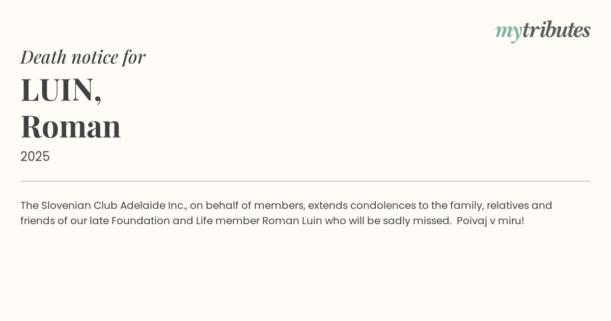 15°CThe Slovenian Club Adelaide Inc., on behalf of members, extends condolences to the family, relatives and friends of our late Foundation and Life member Roman Luin who will be sadly missed. Počivaj v miru!