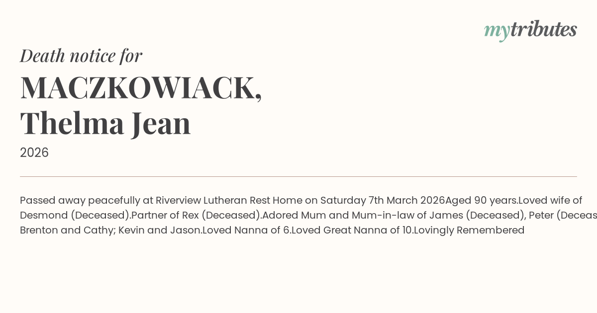 15°CPassed away peacefully at Riverview Lutheran Rest Home on Saturday 7th March 2026