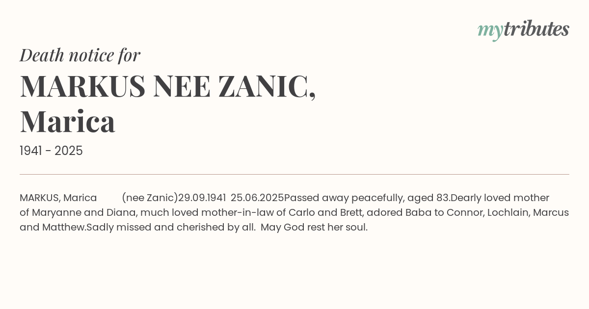 Dearly loved mother of Maryanne and Diana, much loved mother-in-law of Carlo and Brett, adored Baba to Connor, Lochlain, Marcus and Matthew.