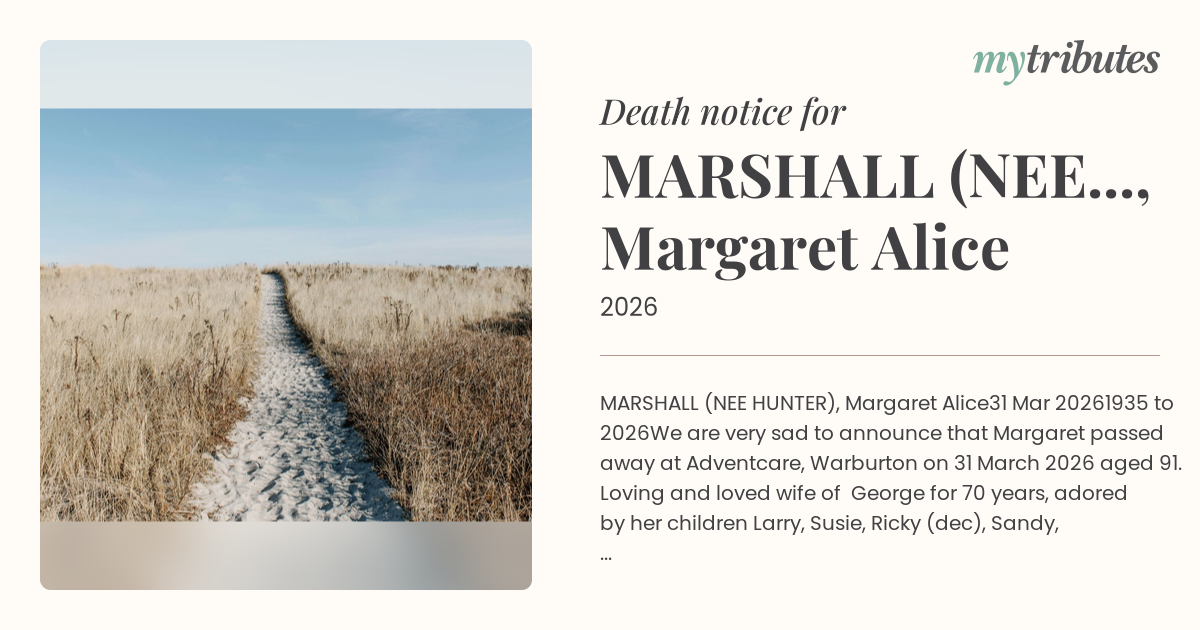 We are very sad to announce that Margaret passed away at Adventcare, Warburton on 31 March 2026 aged 91. Loving and loved wife of George for 70 years, adored by her children Larry, Susie, Ricky (dec), Sandy, Steven and John and their partners Miz, Mick, Simon, Wendy and Rachel. Proud Nanna to 9, Great-Nanna to 7. Marg was much loved by her wider family and her community. She was always there to help and will be very much missed and always remembered.