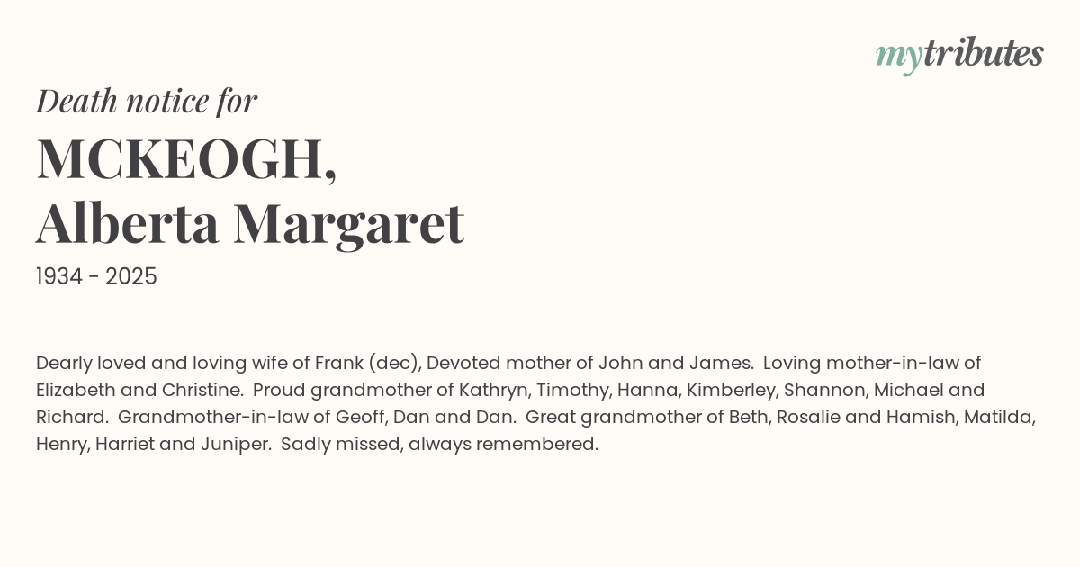 15°CDearly loved and loving wife of Frank (dec), Devoted mother of John and James. Loving mother-in-law of Elizabeth and Christine. Proud grandmother of Kathryn, Timothy, Hanna, Kimberley, Shannon, Michael and Richard. Grandmother-in-law of Geoff, Dan and Dan. Great grandmother of Beth, Rosalie and Hamish, Matilda, Henry, Harriet and Juniper. Sadly missed, always remembered.