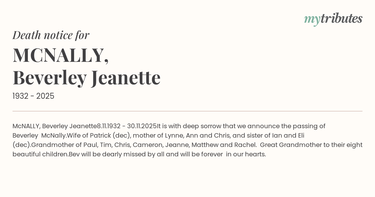 It is with deep sorrow that we announce the passing of Beverley McNally.