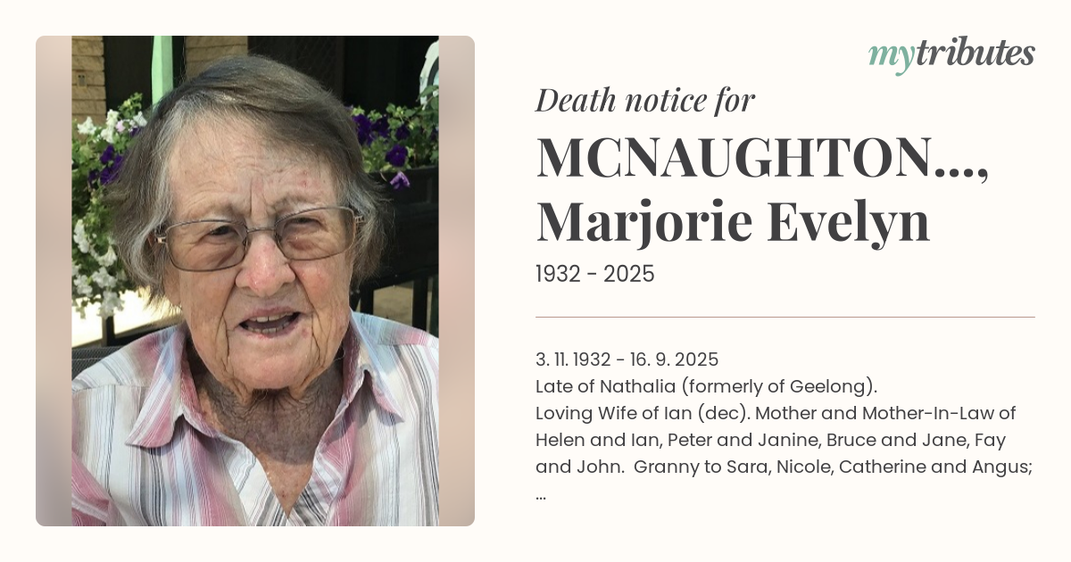 Loving Wife of Ian (dec). Mother and Mother-In-Law of Helen and Ian, Peter and Janine, Bruce and Jane, Fay and John. Granny to Sara, Nicole, Catherine and Angus; Katrina, Lucille and Timothy; Fiona, Claire and Amy. Adored Great Granny to 18 Great Grand Children.