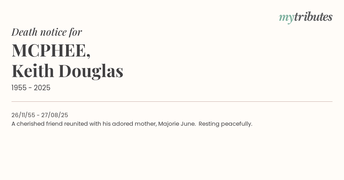 A cherished friend reunited with his adored mother, Majorie June. Resting peacefully.