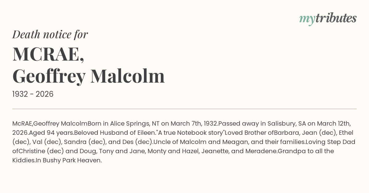 Passed away in Salisbury, SA on March 12th, 2026.