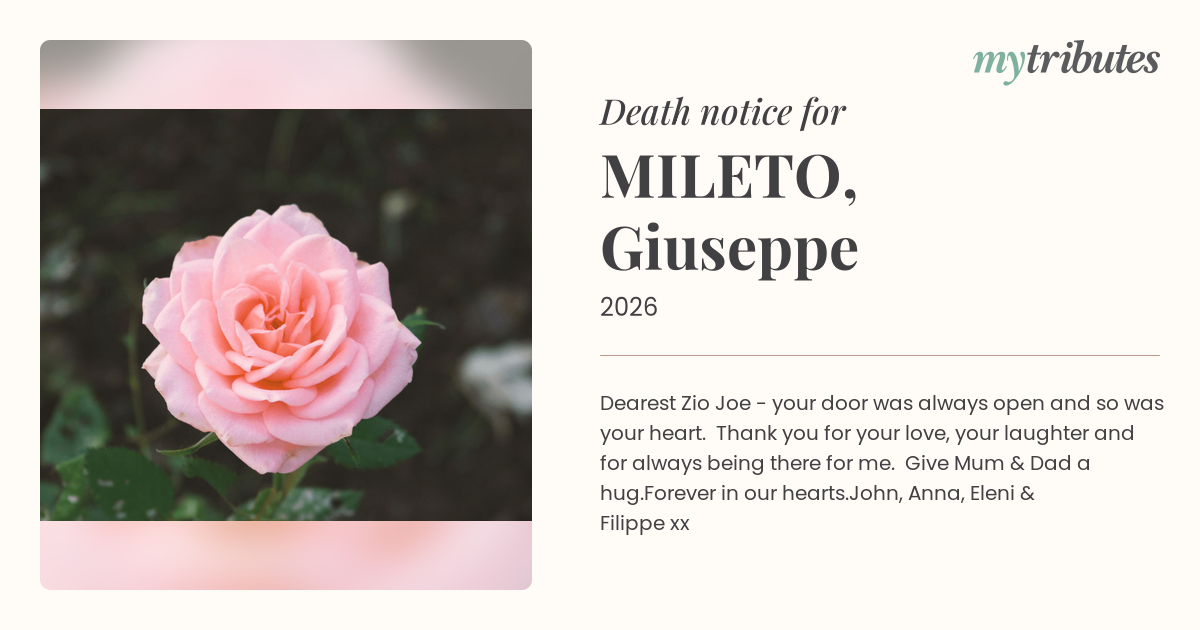 15°CDearest Zio Joe - your door was always open and so was your heart. Thank you for your love, your laughter and for always being there for me. Give Mum & Dad a hug.