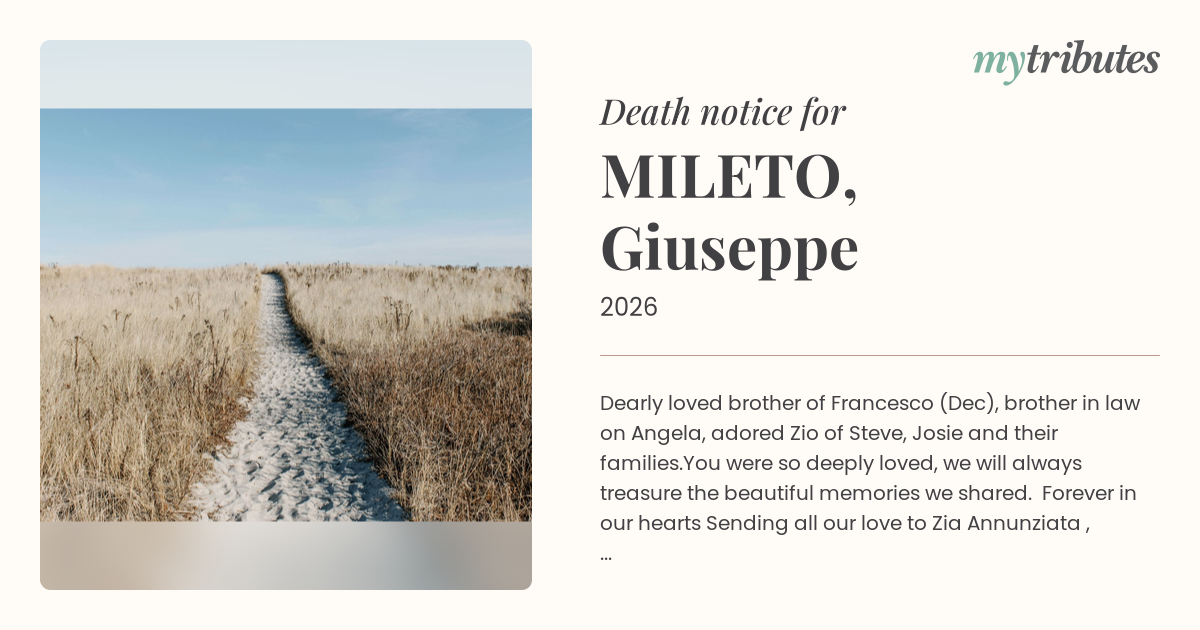15°CDearly loved brother of Francesco (Dec), brother in law on Angela, adored Zio of Steve, Josie and their families.
