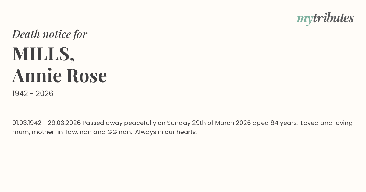 15°C01.03.1942 - 29.03.2026 Passed away peacefully on Sunday 29th of March 2026 aged 84 years.